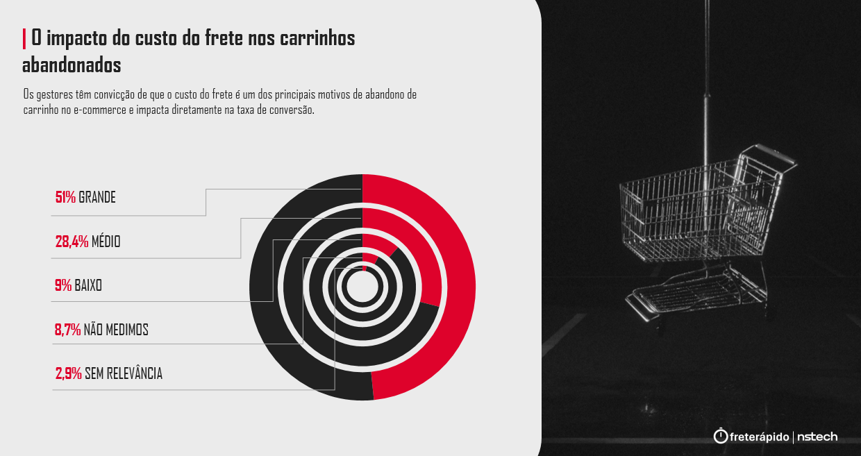 Além disso, 51% consideram grande o impacto do custo do frete nos carrinhos abandonados; 34,5% relatam facilidade e agilidade na integração de novas transportadoras; e 24,2% já perderam oportunidades comerciais por limitações nos sistemas logísticos.