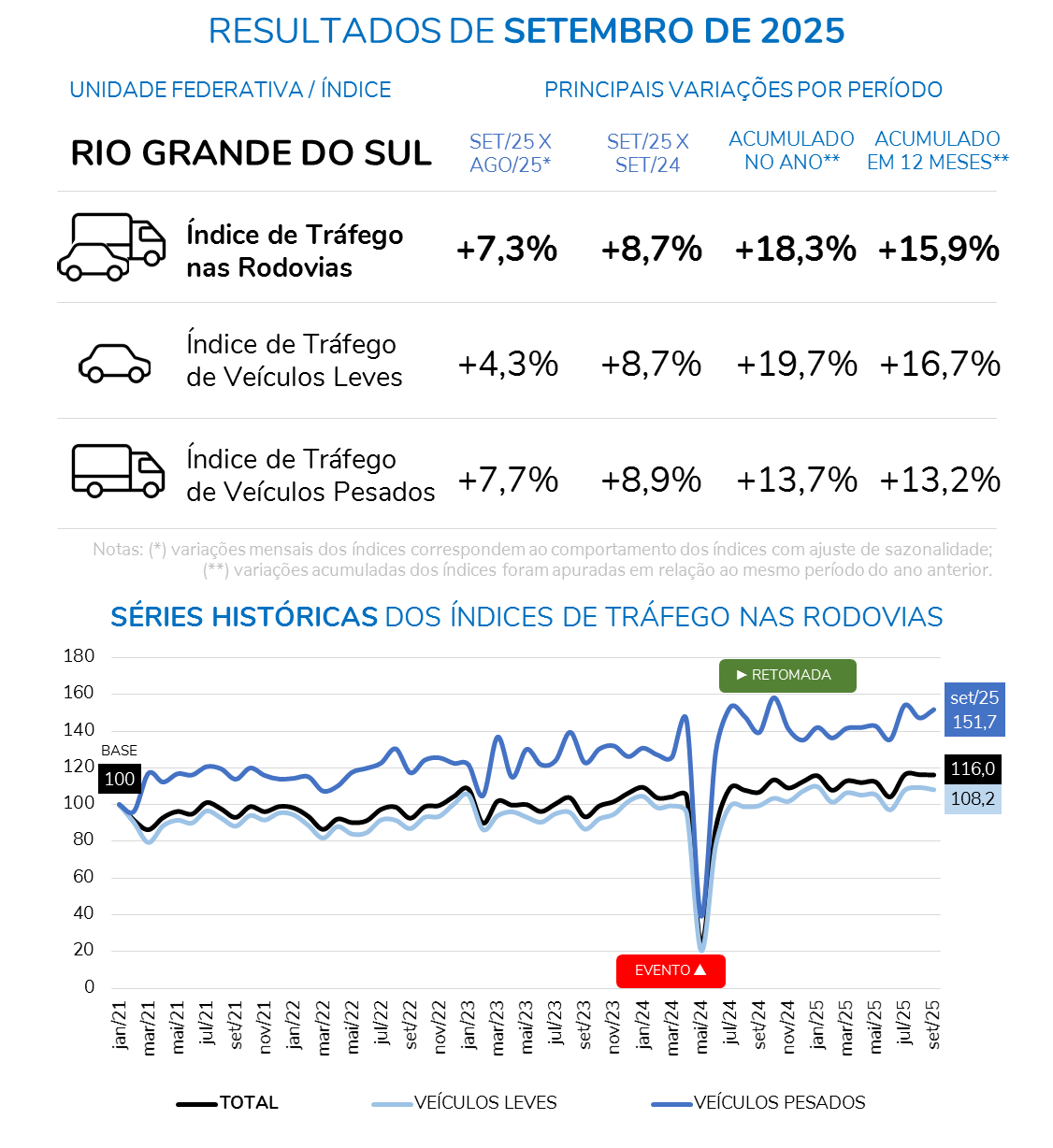 Já as estradas gaúchas registraram alta de 8,9% sobre os números de setembro de 2024, uma variação que ainda reflete os efeitos da base estatisticamente deprimida após o evento climático extremo ocorrido em maio de 2024. No acumulado do ano, o crescimento no tráfego de pesados alcançou 13,7%, enquanto nos últimos 12 meses a elevação foi de 13,2%.