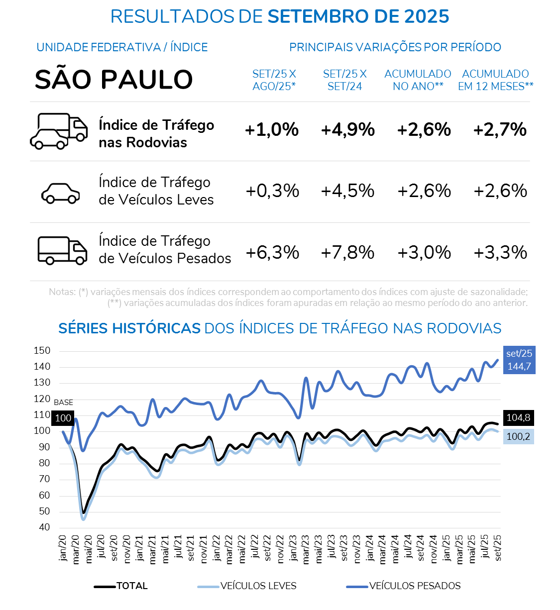 No comparativo com o mesmo mês de 2024, o crescimento nas rodovias paulistas foi ainda mais significativo, alcançando 7,8%. No acumulado do ano até setembro, o avanço foi de 3,0%, enquanto o desempenho dos últimos 12 meses mostra aumento de 3,3% no volume de viagens com veículos pesados nas rodovias paulistas.